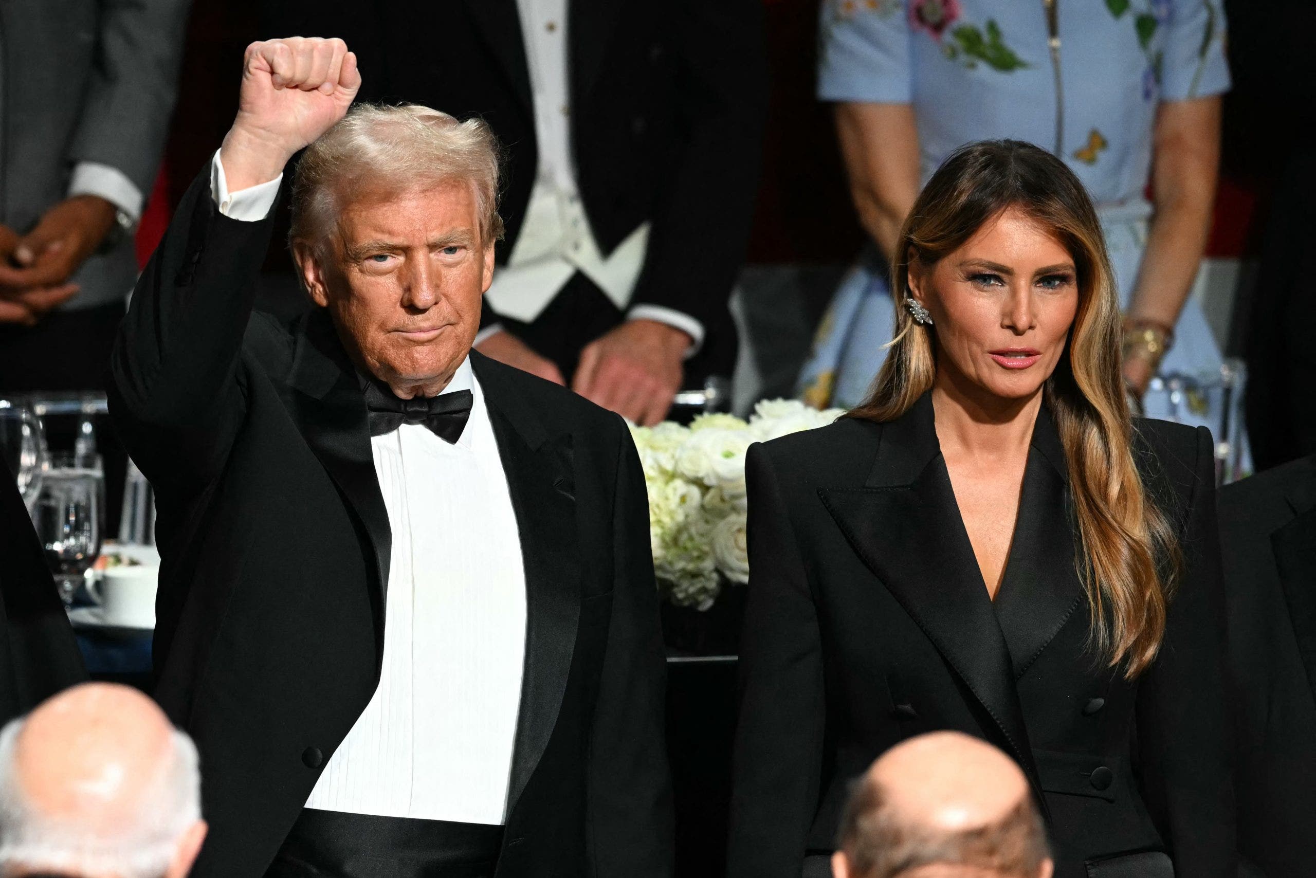 Former US President and Republican presidential candidate Donald Trump raises his fist as he and his wife Melania Trump attend the 79th Annual Alfred E. Smith Memorial Foundation Dinner at the Hilton Midtown in New York, October 17, 2024. (Getty Images)